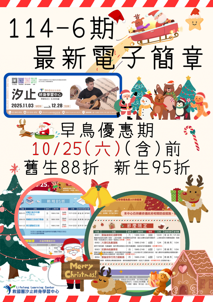 114-6期電子簡章出刊囉! 紙本簡章需要再等等 電子簡章:https://reurl.cc/vLzg2o 9/29(一)起開放臨櫃報名 早鳥優惠期10/25(含)前截止 線上報名:https://scr.cyc.org.tw/tp21.aspx