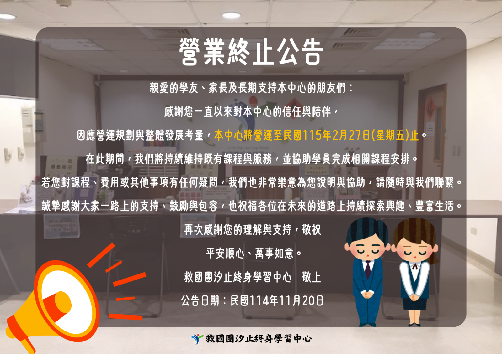 我們在此向各位鄭重公告:本中心將營運至民國115年2月27日(星期五)止。